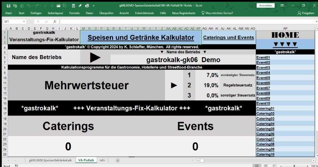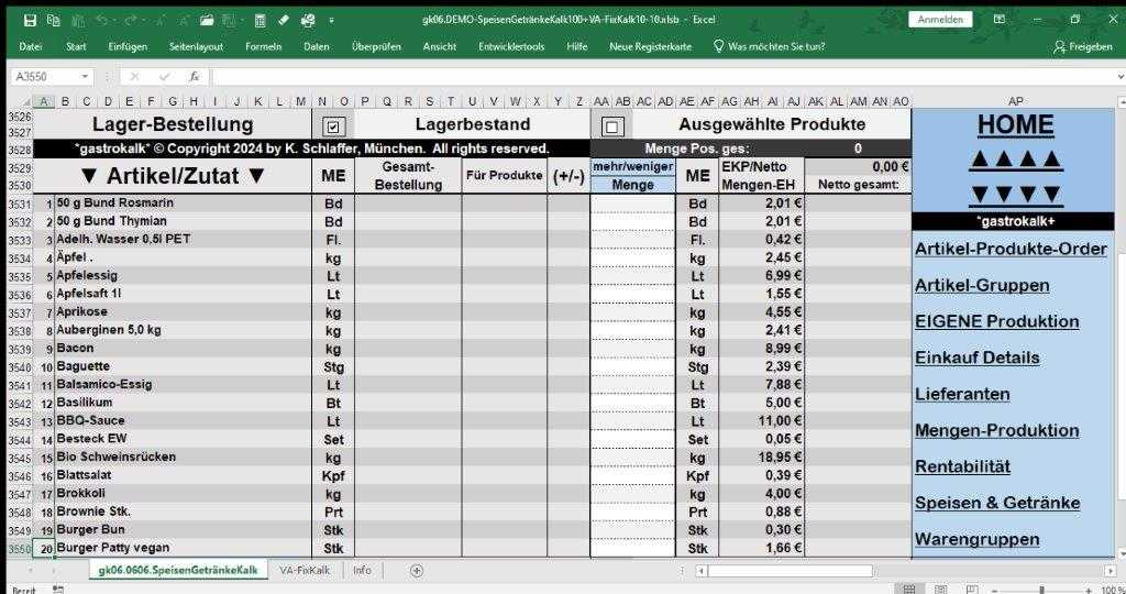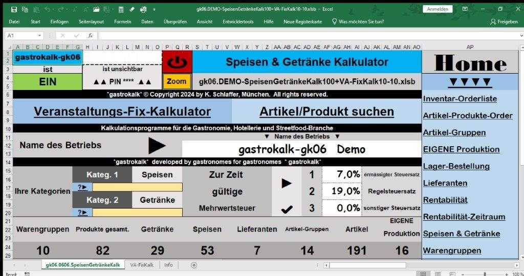 Mit dem Programm können Sie den geldwerten Anteil der produktspezifischen Merkmale am Wareneinsatz für alle Produkte berechnen, aber auch für Caterings, Veranstaltungen oder Zeiträume ( Monat, Quartal, etc)
